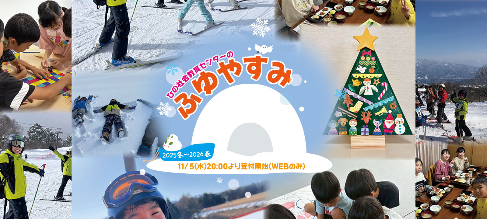 SPECIAL 特集 ひの自然学校・2025年度冬休み企画 ひの自然学校・チャレンジ教室冬休み企画の詳細と参加申込について ただいま特設サイトにてお申し込みを受け付け中です! こちらの特設WEBサイトからのみ受付となります。 ↓ ひの自然学校・チャレンジ教室2025年度冬休み企画特設サイト 11/5(水)20:00より受付開始!