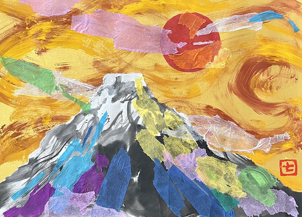 和紙に墨で富士山をダイナミックに描き、金色の台紙にお花紙と一緒にレイアウトします。